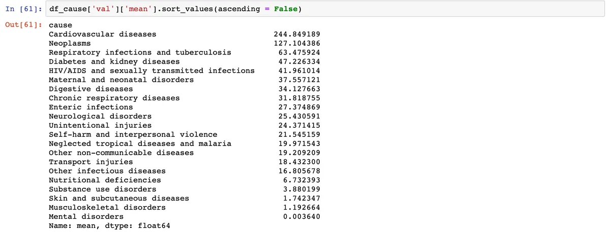 Выбрать определенные столбцы можно точно так же, как и в обычном датафрейме. Выберем средние показатели смертности и отсортируем по убыванию. Получим самые частые причины смерти в мире с 2000 по 2019. Лидируют сердечно-сосудистые заболевания и рак.