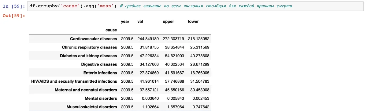 Это один из методов, которые чаще всего используются в Pandas. Он позволяет сгруппировать данные и быстро получить нужную статистику. Например, посмотрим среднюю смертность для каждой из причин по всем странам и за все годы.