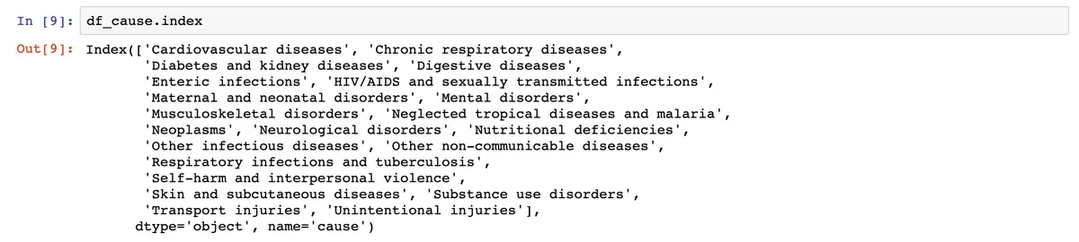 Можно задать и множественный индекс (multi index) и добавить в индексы не только страны, но и годы. Тогда мы увидим, как менялась смертность от разных причин по странам с годами.