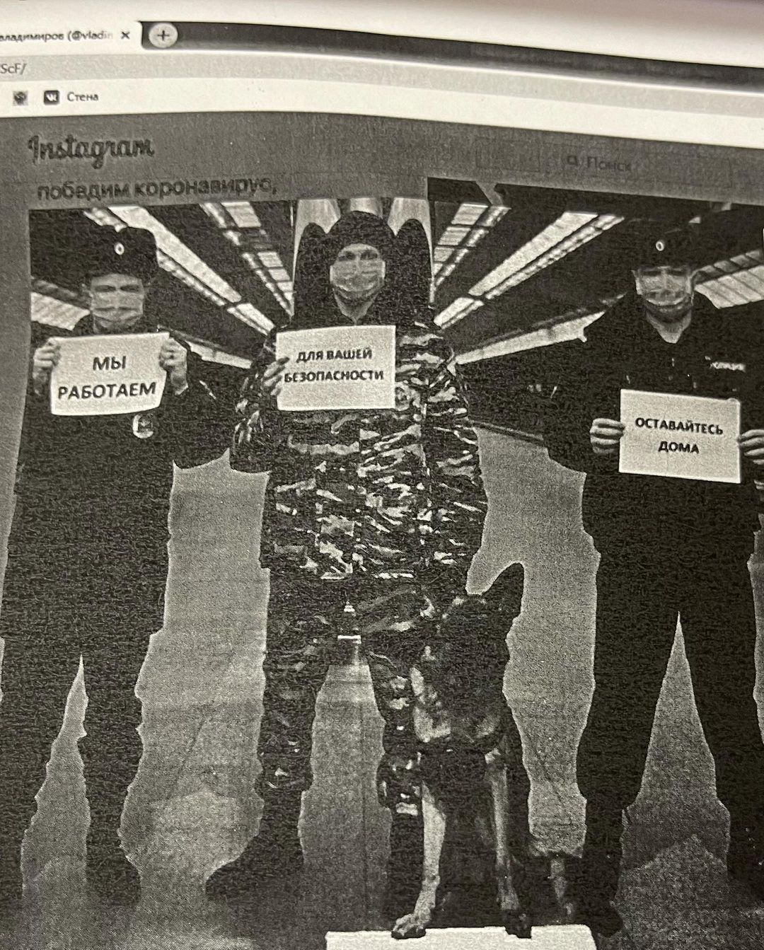 Пост совпровождался картинкой с тремя полицейскими, державшими плакаты «Мы работаем», «для вашей безопасности», «Оставайтесь дома». «Только там была еще небольшая оскорбительная плашечка, которую я не заметил», — добавил Владимиров. На ней было написано «Позор полиции», уточнил он «Открытым медиа».