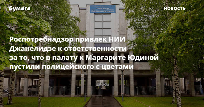 В петербургском отделении Роспотребнадзора признали, что НИИ скорой помощи имени Джанелидзе нарушил эпидемиологическое законодательство, пропустив полицейского в палату к Маргарите Юдиной. Такой ответ получила «Команда 29» на свое обращение.