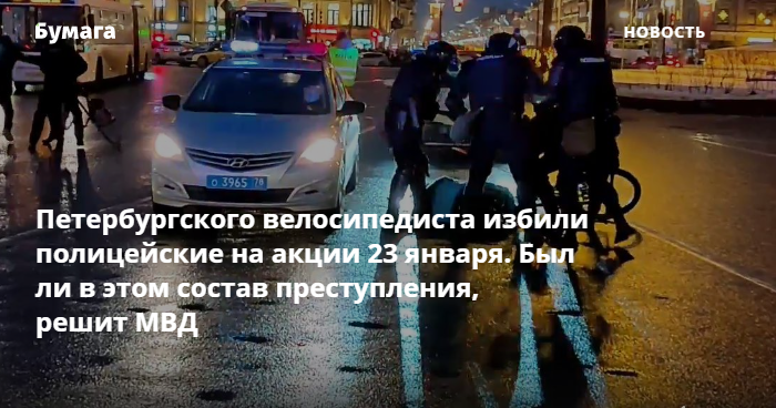 Инцидент произошел на протестной акции 23 января на площади Восстания. Видеозапись нападения сотрудников полиции на мужчину на велосипеде опубликовала «Фонтанка».