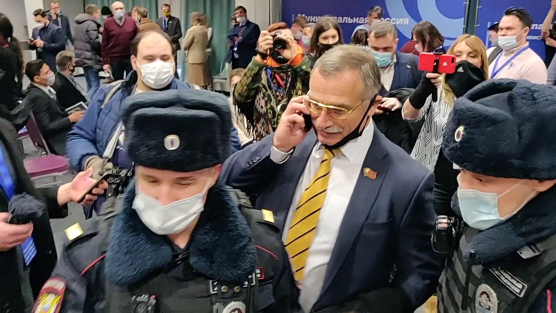 Пришел снимать форум муниципальных депутатов. Приехало очень много полиции, всех задерживают, меня тоже. pic.twitter.com/dS3QLh9dHl