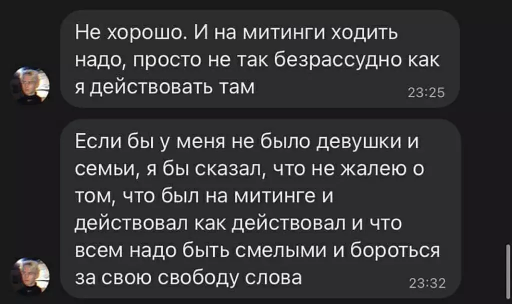 Однако другая подруга экс-оппозиционера, Ирина, считает иначе. Она рассказала, что кроме боязни оказаться за решеткой, Дима опасался за жизнь своей девушки и пытался так обезопасить членов своей семьи от потери работы из-за происходящего с ним. И предоставила подтверждающий ее слова скрин из переписки.