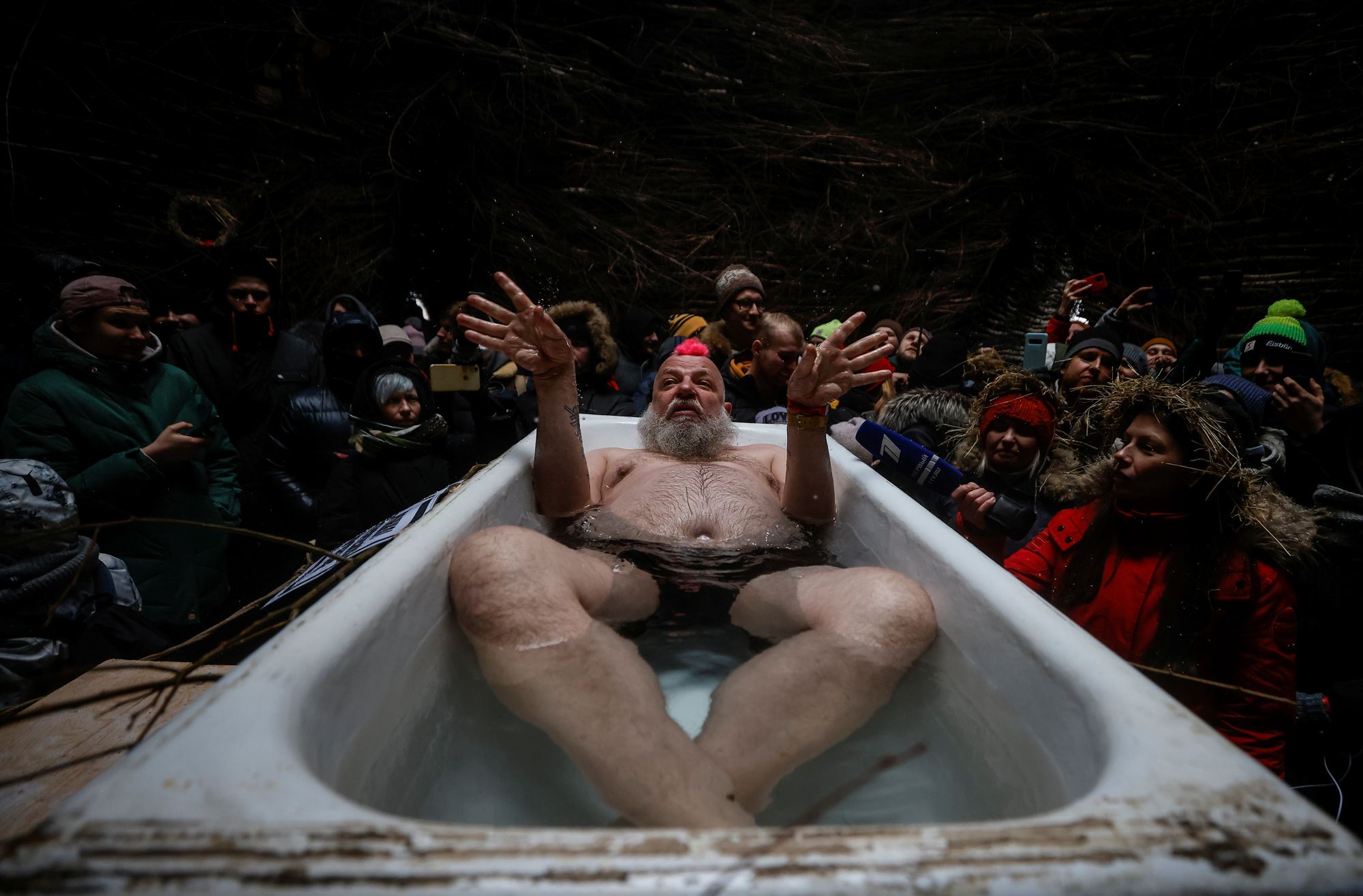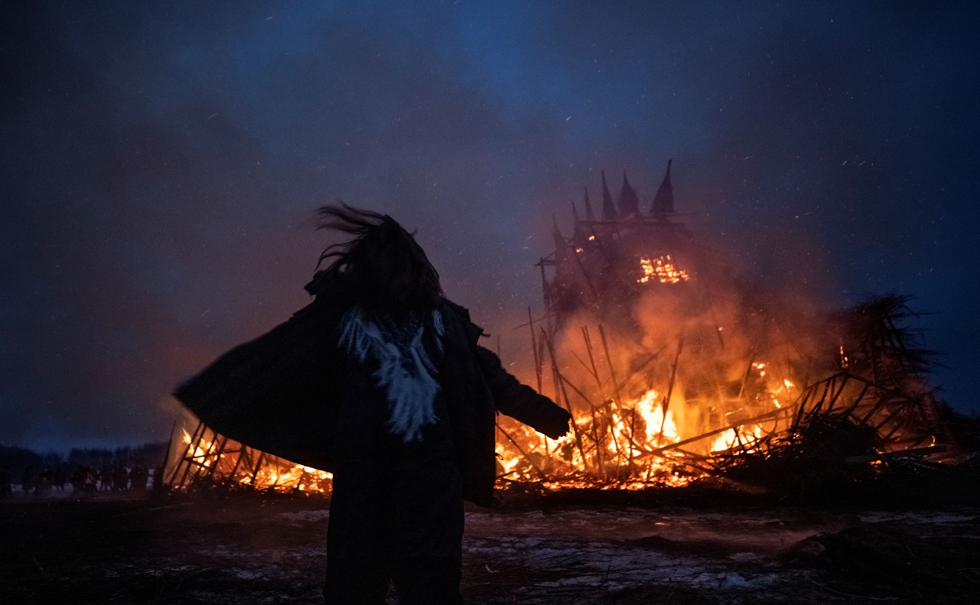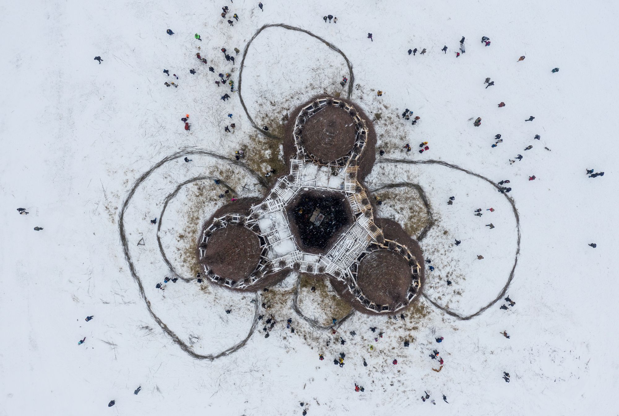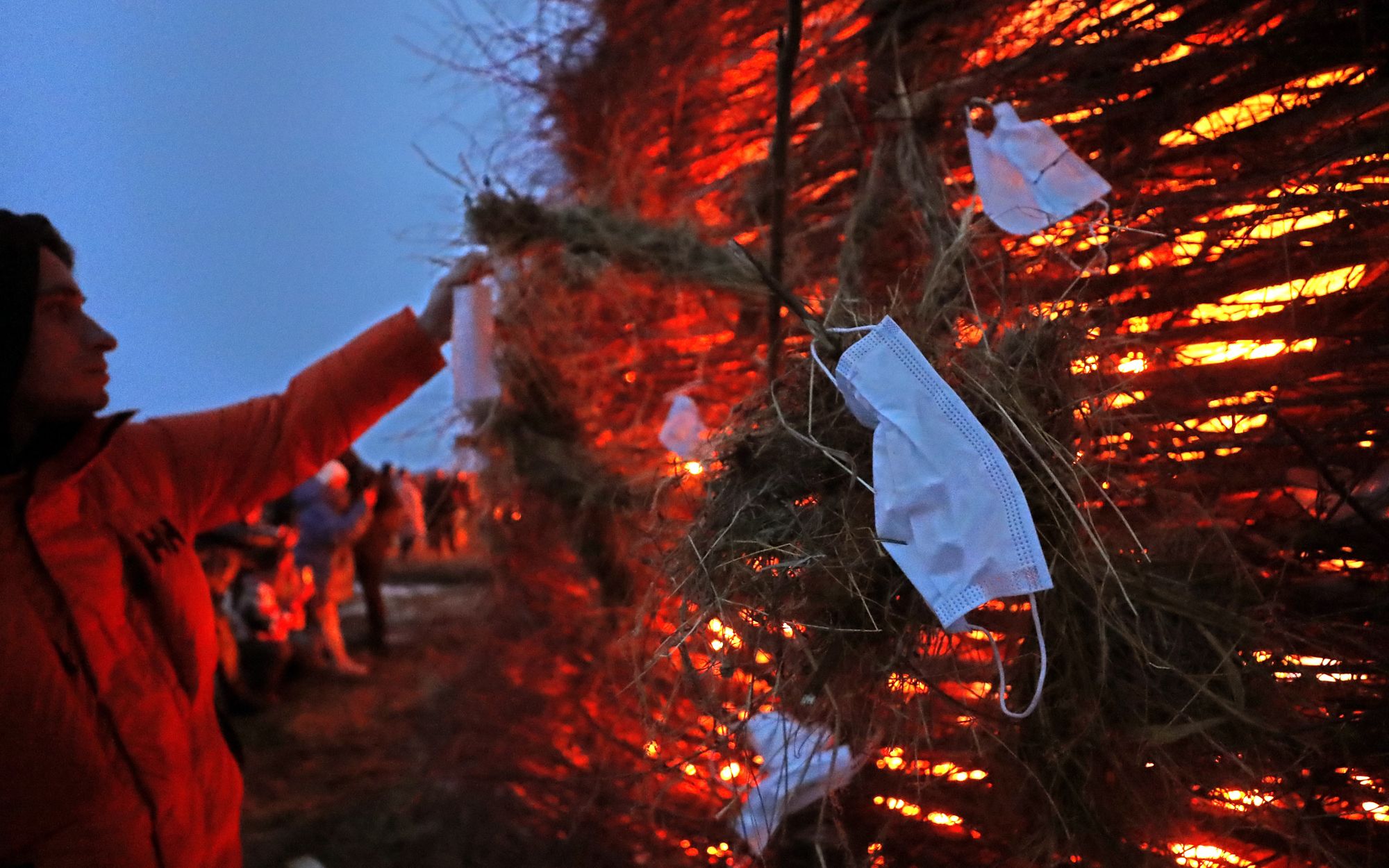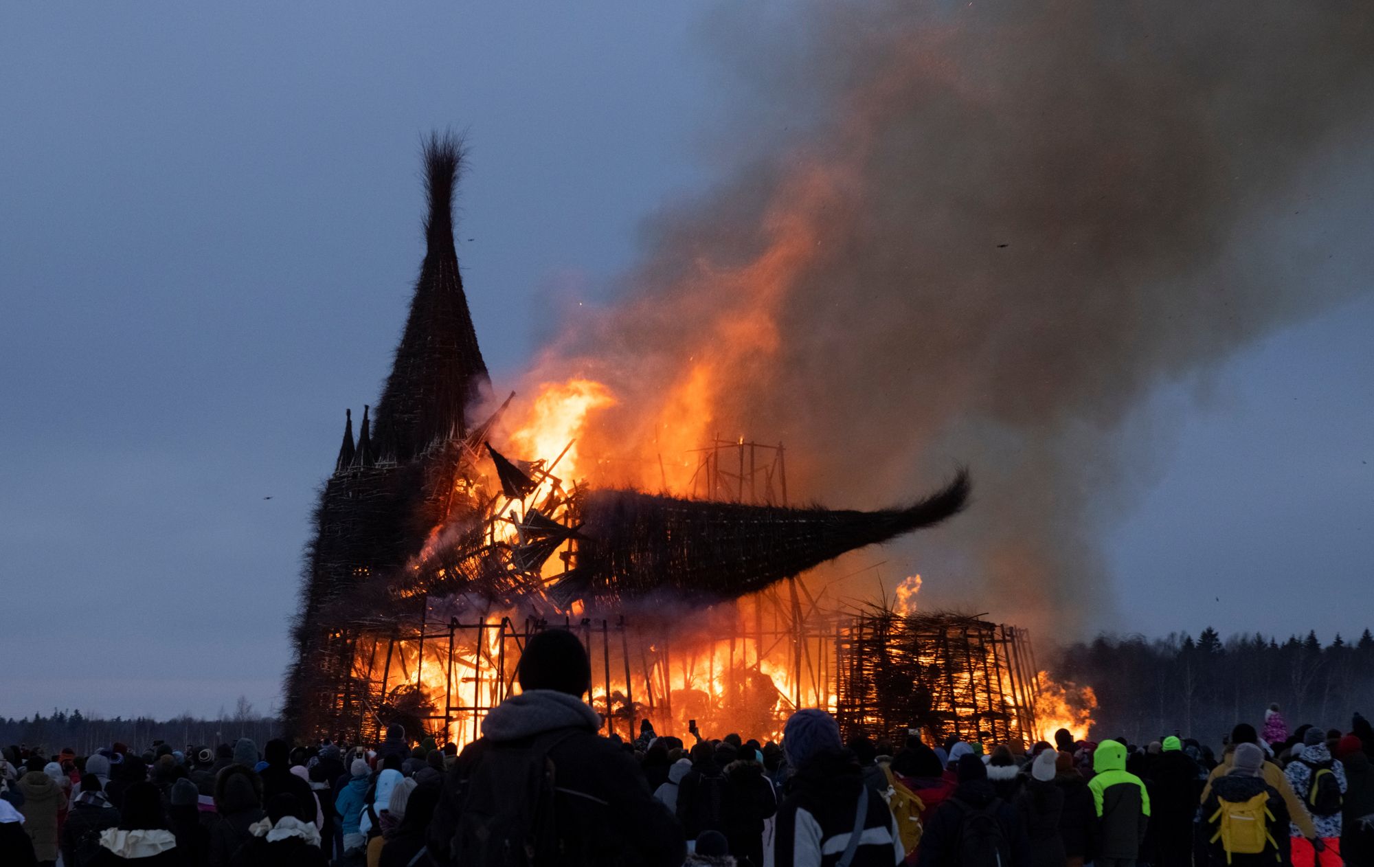 Over the weekend, Russia celebrated the closing of Maslenitsa — an end-of-winter festival that combines elements of folk and religious traditions. For its 2021 festivities, the Nikola-Lenivets Art park, located in a village in the Kaluga region, chose the theme of the coronavirus pandemic. Attendees took in a performance by Moscow artist Sergey Pakhomov (a.k.a “Pakhom”) and the festival ended with the ceremonial burning of a wicker “Vaccination Tower,” which was built to resemble “a giant vial or a covid-cannibal castle.” “As soon as we burn it, the disease will subside and everyone will be healthy,” said the artist who created the tower, Nikolai Polissky, who founded the art park. Here’s an inside look at the celebrations in Nikola-Lenivets.
