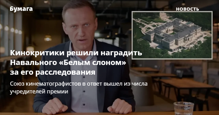 Экспертный совет премии «Белый слон» рассказал о конфликте с правлением гильдии киноведов и кинокритиков союза кинематографистов, учредившей премию. Это произошло после того, как совет решил присудить Алексею Навальному приз «Событие года» за его расследования.