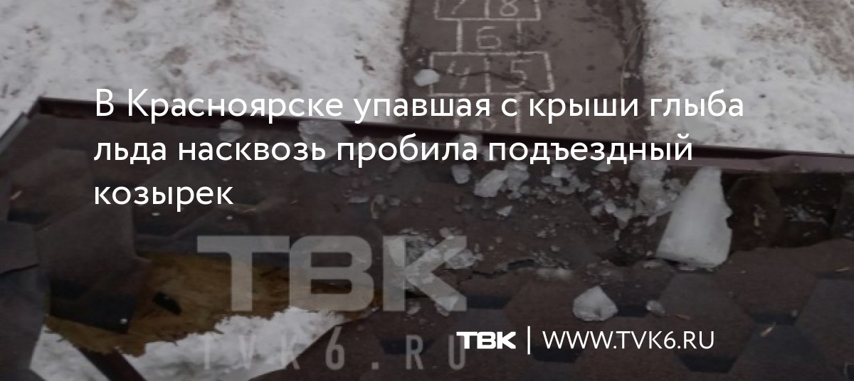 «Были нормальные, бетонные, но почему-то их признали аварийными. Поставили эти козыречки, тоненькие такие. Там что-то вроде ДСП, покрытого резиновым материалом. Предлагали профлист, но я сказала, что он там не нужен, потому что во время дождя от него сильный шум – жители 1,2,3, этажей спать не смогут».«ТВК Красноярск» обратились в пресс-службу УК «ЖСК». Там объяснили, что работы по уборке льда с крыши были запланированы на выходные, но из-за сильного ветра их отложили. В пятницу же после разрушения козырька специалисты выехали на место и установили, что угрозы новых обрушений нет. Почистить крышу планируют на этой неделе, а восстанавливать козырек будут уже сейчас.