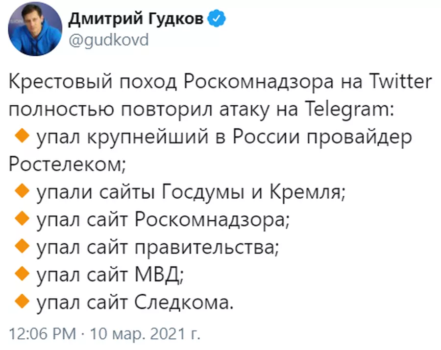 Знаете, откуда я узнавал обо всём этом в режиме реального времени? Из Твиттера. И на секунду мне показалось, что он стал прогружаться немного быстрее. Для чистоты эксперимента надо сказать, что затормозили даже работу YouTube и Google. То есть в рамках операции по точечному «замедлению» Твиттера РКН сработал диаметрально противоположным образом, грохнув буквально всё, кроме Твиттера.