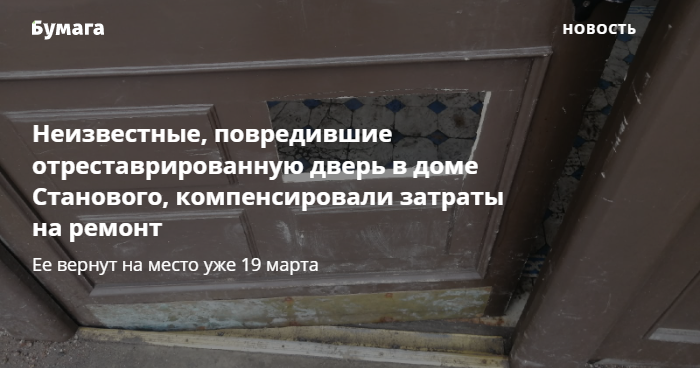 Один из неизвестных, повредивших ночью 13 марта дверь в доме Станового на Мытнинской улице, компенсировал затраты на ее ремонт, сообщил местный житель и активист Ярослав Костров. На место дверь планируют вернуть уже 19 марта.