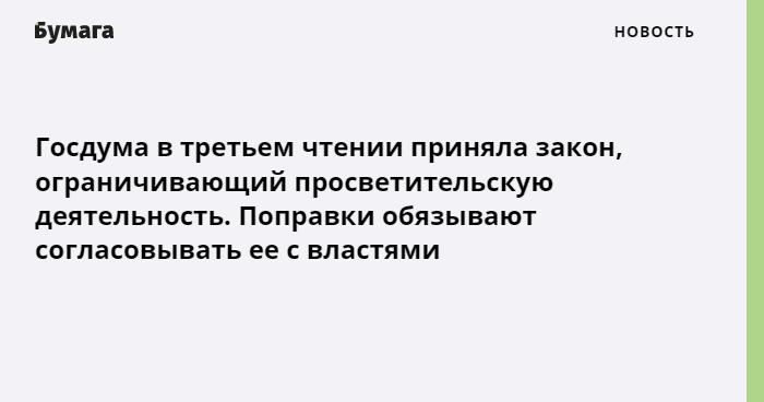 Госдума в третьем чтении приняла законопроект, ограничивающий просветительскую деятельность в России. Об этом сообщает ТАСС. Такую деятельность теперь можно вести только по согласованию с властями.