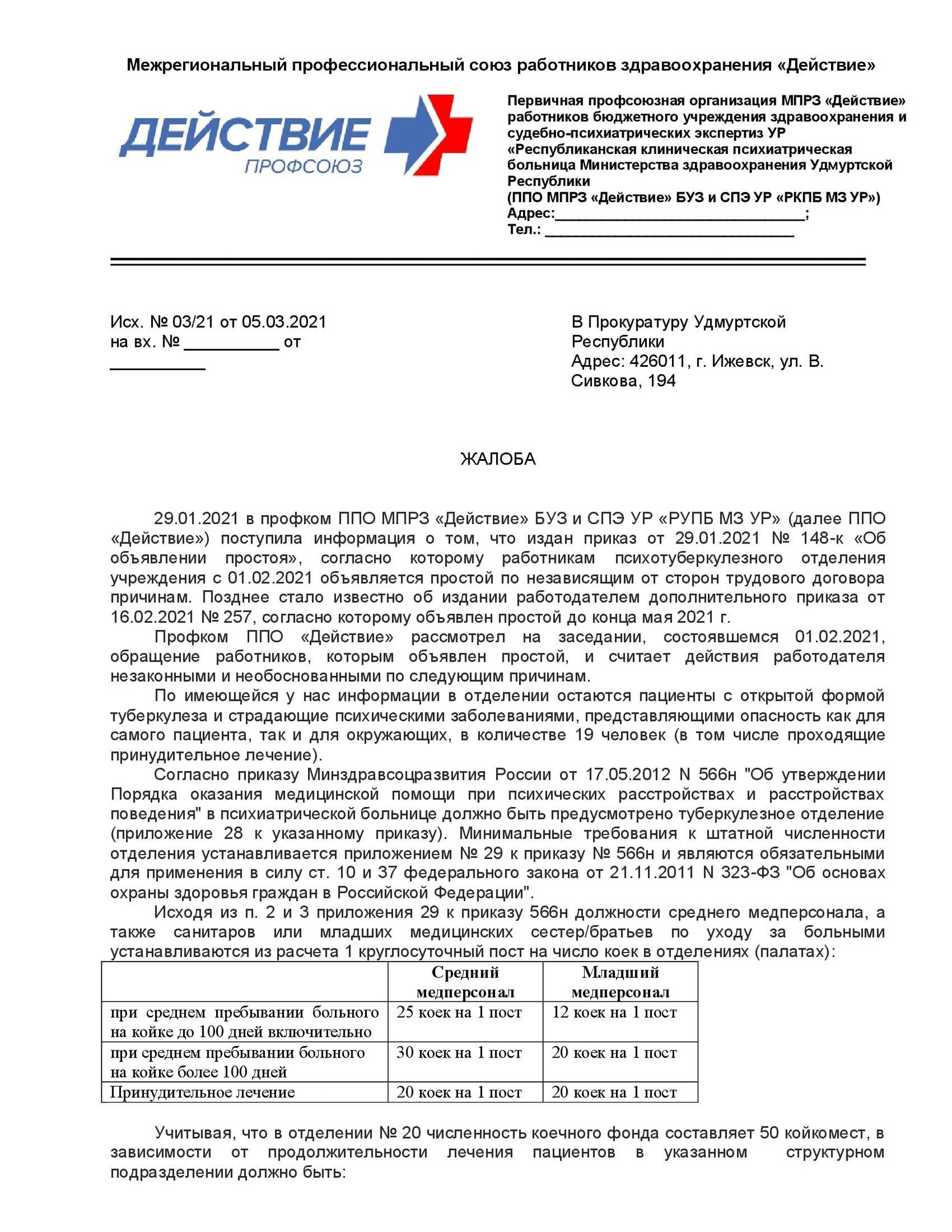 Позиция профсоюза "Действие" - выражение протеста и недоверия такой политике и действиям региональных властей. В рамках сохранения единственного психотуберкулезного отделения от первичной профсоюзной организации была оформлена и направлена жалоба в прокуратуру Удмуртской Республики. А также начат сбор подписей жителей города Можги под соответствующим коллективным обращением.