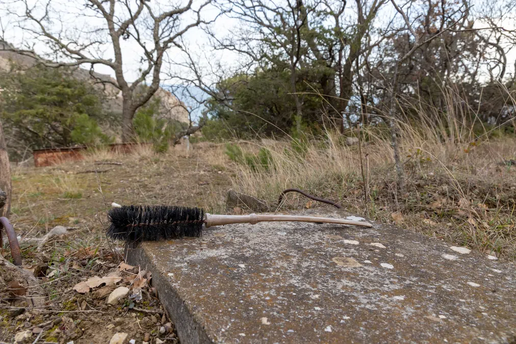 Удивительно, но на одном из участков мы обнаружили туалетный ершик. То ли он лежит здесь в знак протеста, то ли попал случайно, ведь привычных унитазов на дачах нет.