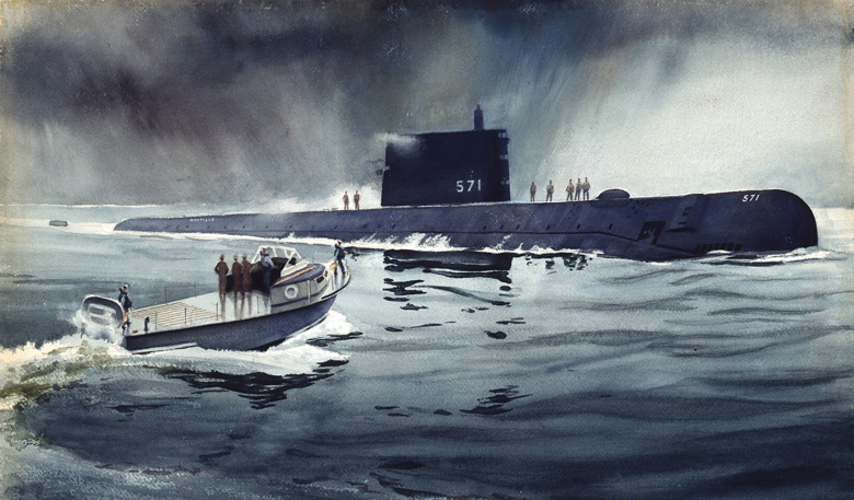 Первая в мире атомная подводная лодка USS Nautilus вступила в строй в 1954 году. Акварель Альберта Мюррея, 1959