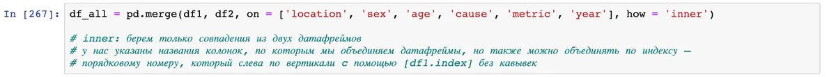 В аргументе on прописываем, в каких столбцах должны совпасть значения в обоих датафреймах. Аргумент how определяет, как именно объединить строки датафрейма: