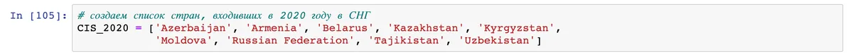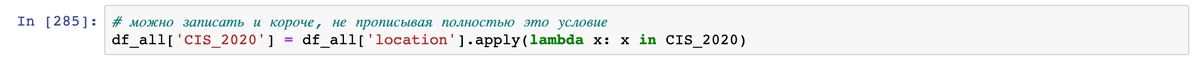 В Pandas очень удобно пользоваться короткими lambda-функциями, которые открывают много возможностей для анализа данных. Например, давайте создадим новый столбец, в котором будет True, если страна (location) входила в 2020 году в СНГ, и False, если нет. Представим, что нам зачем-то нужна эта информация. Для начала создадим список таких стран.