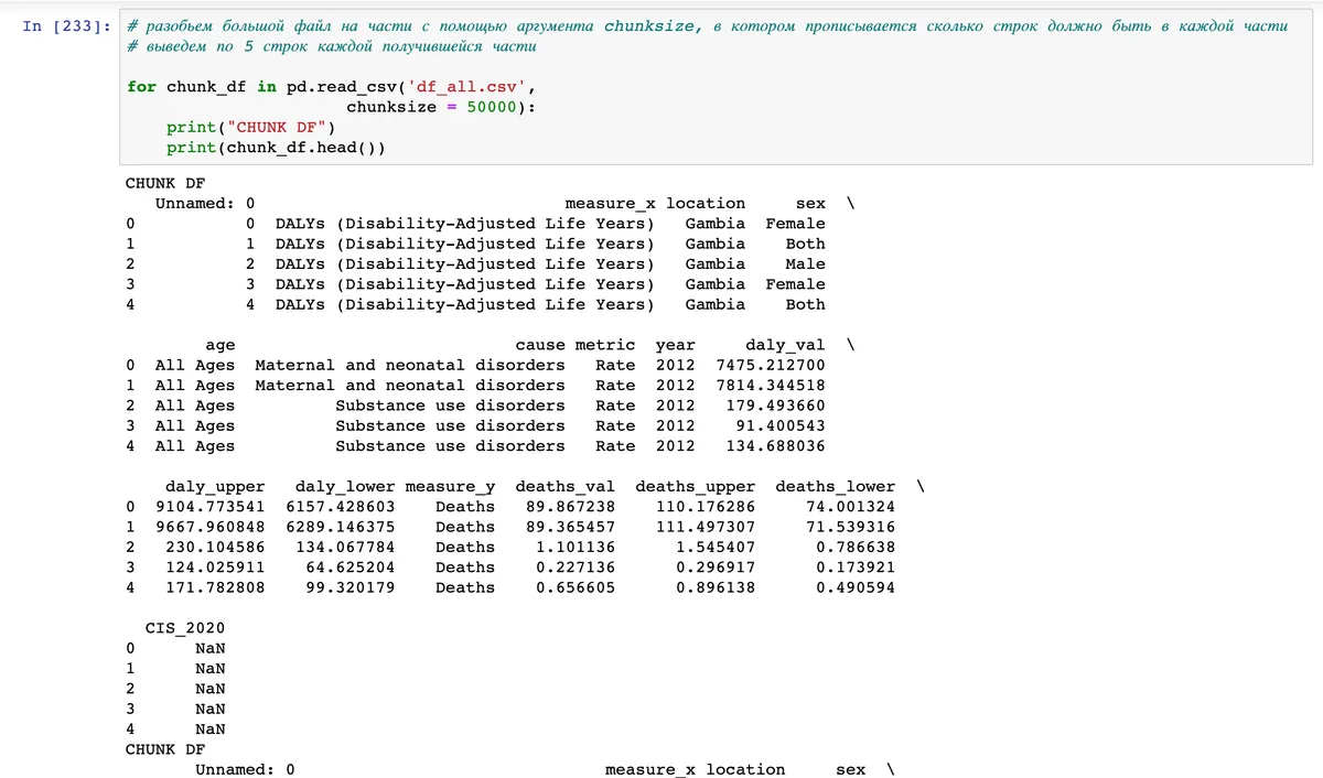 В наших датафреймах от 90 от 257 тысяч строк, и обрабатывались они очень быстро. Но предположим, в файле не 257 тысяч, а миллионы строк. Такой файл будет долго грузиться, и работать с ним будет неудобно. Но Pandas позволяет легко работать и с большими файлами тоже. Для этого при загрузке есть параметр chunksize — или части, фрагмента, на которые мы хотим разбить файл, в затем работать с ними по отдельности, чтобы ускорить процесс.