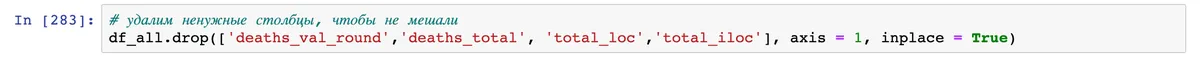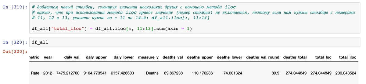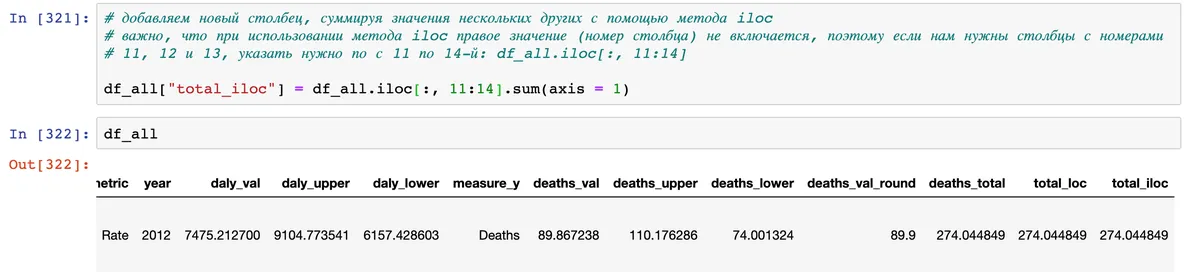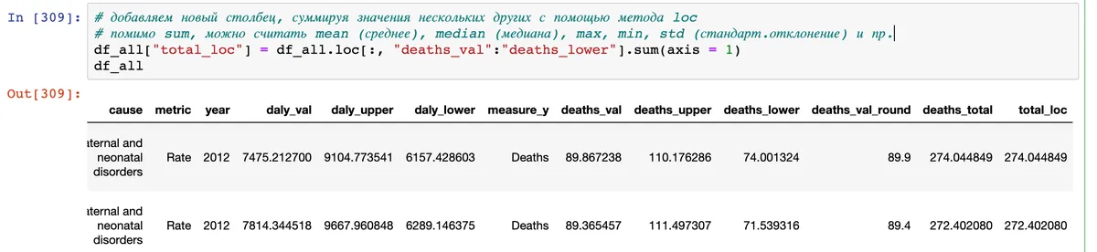 Появился новый столбец deaths_total. Точно так же можно суммировать с помощью сочетания методов loc и sum (вместо sum может быть и mean (среднее), median (медиана), std (стандартное отклонение), min, max и пр.).