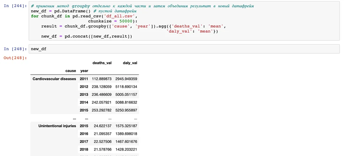 С каждым из файлов теперь можно проделать какие-то операции по отдельности — выбрать нужные строки, посчитать параметры, удалить ненужное, а затем объединить их уже в более компактный датафрейм. Например, применим функцию groupby отдельно для каждой части и затем склеим их в одну. Чтобы это сделать, сначала нам нужно создать пустой датафрейм, а затем присоединять к нему результаты применения метода groupby для каждой части. Подробнее о методе groupby — во втором уроке. В получившемся датафрейме у нас будут не все строки из всех частей, а только нужные нам расчеты: как менялась средняя смертность и потерянные трудоспособные годы жизни от разных причин с годами.
