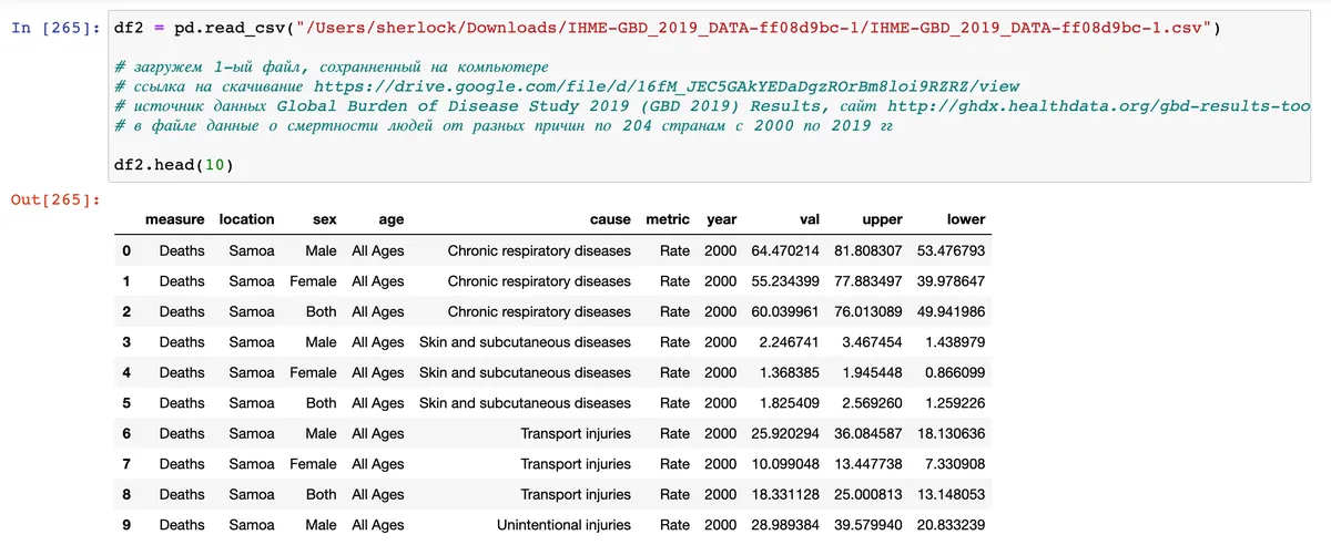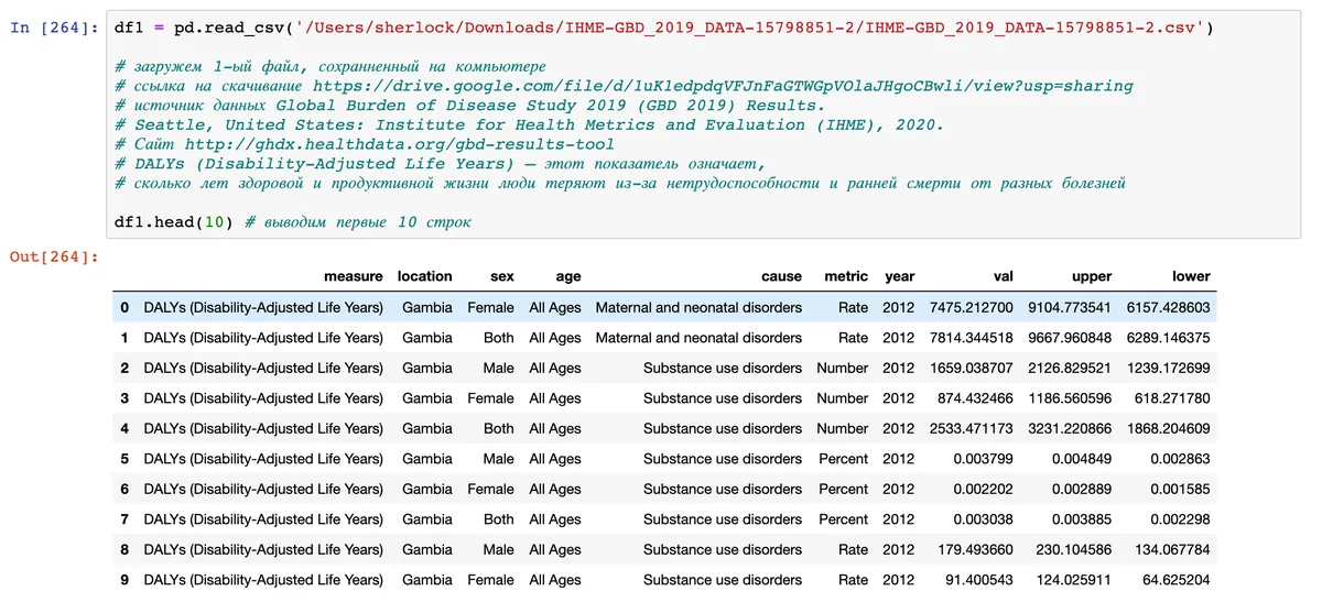 Объединение датафреймов — задача, которую приходится решать довольно часто. Чтобы научиться это делать, скачаем еще один файл в дополнение к данным по смертности, с которыми мы работали во время первых двух уроков. Скачаем файл на том же сайте Проекта по изучению глобального бремени болезней Института оценки показателей здоровья США (IHME GBD). Выберем те же показатели, что на первом занятии, только в графе measure выберем не deaths, а DALYs (Disability-Adjusted Life Years). Этот показатель означает, сколько лет здоровой и продуктивной жизни люди теряют из-за нетрудоспособности и ранней смерти от разных болезней. Его еще называют измерением разрыва между текущим состоянием здоровья людей и идеальной ситуацией, когда все население доживает до преклонного возраста, не страдая от болезней и инвалидности.