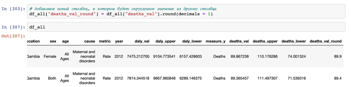 На первом уроке мы уже научились добавлять новые столбцы на основе операций с другим столбцами. Мы создавали новый столбец, в котором было округленное до одной десятой значение показателя смертности.