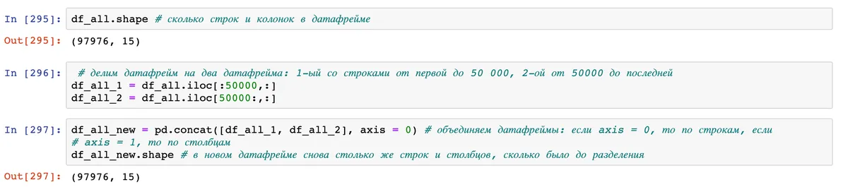 Еще один метод объединения датафреймов — concat(). Чтобы его опробовать, разделим датафрейм на две части. В первой будут строки с первой до 50 000, во второй с 50 000 и до последней. А затем объединим их обратно методом concat(). Аргумент axis = 0 опять означает, что объединяем по строкам, а не по столбцам.