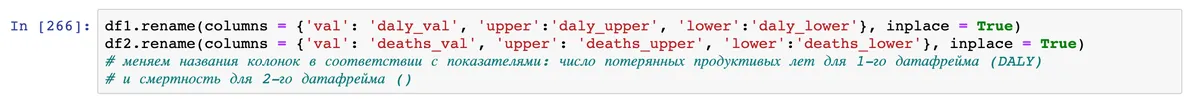 Некоторые значения в столбцах в обоих датафреймах совпадают, а некоторые отличаются. Страна (location), пол (sex), возрасты (age), причины (cause), год (year) — одинаковые. А вот измерение (measure), а также числовые показатели val, upper и lower отличаются. В столбце metric тоже разные значения. Давайте объединим эти датафреймы, просто добавив новые значения (DALY, число потерянных лет из-за нетрудоспособности и ранней смерти от разных болезней) к тем данных по смертности, что у нас уже есть.