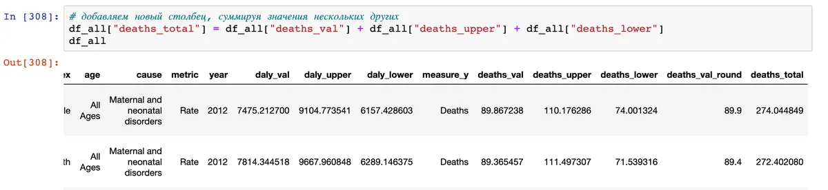 Точно так же можно создать новый столбец на основе не одного, а нескольких других столбцов. Например, суммируя их. Попробуем суммировать столбцы death_val, death_upper, death_lower. В случае с нашими данными сумма этих показателей нам ничего не даст, это нужно просто для тренировки.