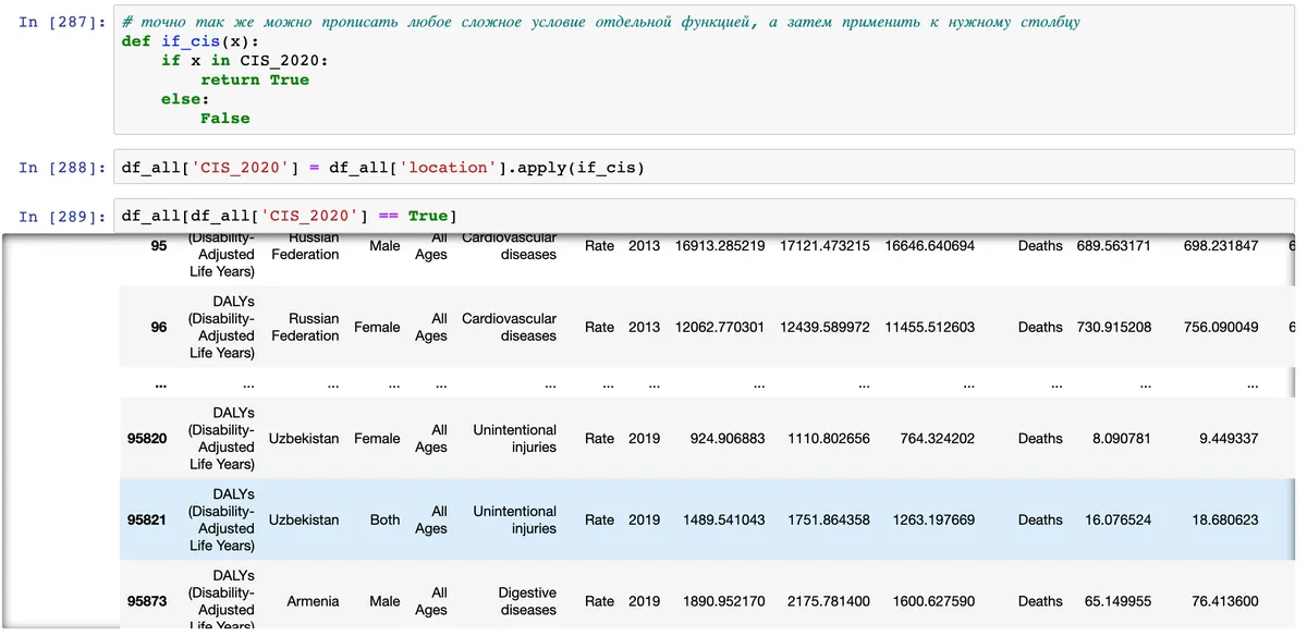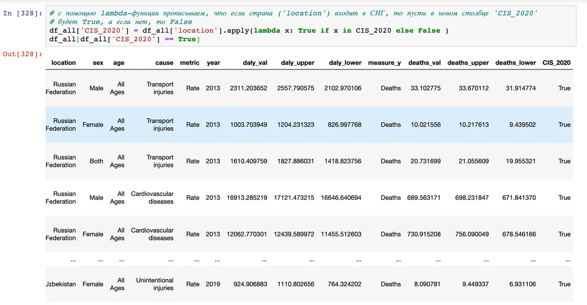 Но lambda-функция подходит, только если функция короткая и простая. Если она сложнее, то нужно отдельно прописать ее и затем точно так же подставить для создания нового столбца. Пропишем ту же функцию, что и выше со странами СНГ, но отдельно. Точно также можно прописать любую более сложную функцию. Урок по функциям можно найти здесь.