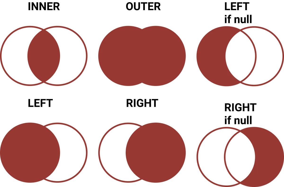 left — только совпадающие строки плюс все строки из левого датафрейма