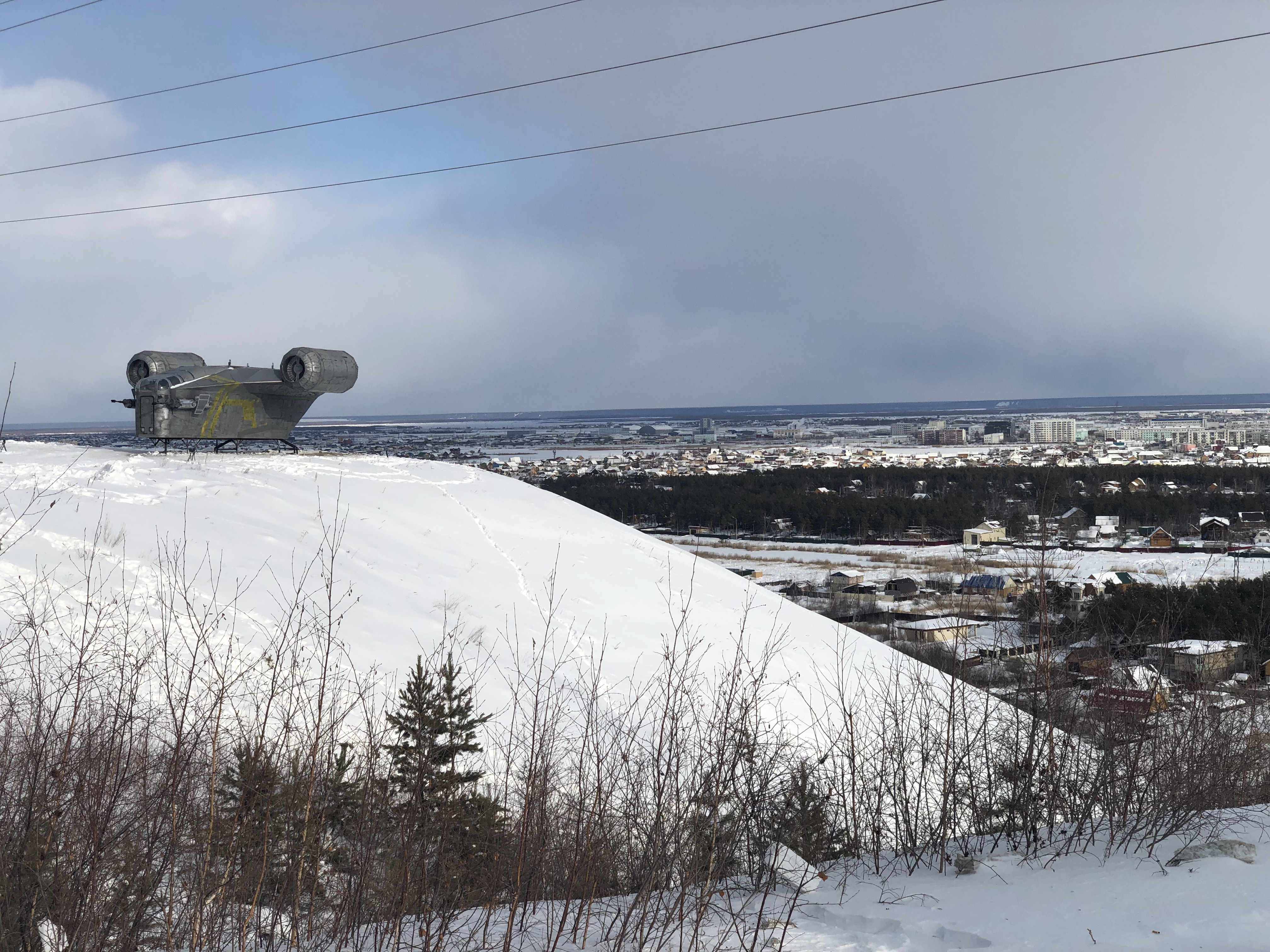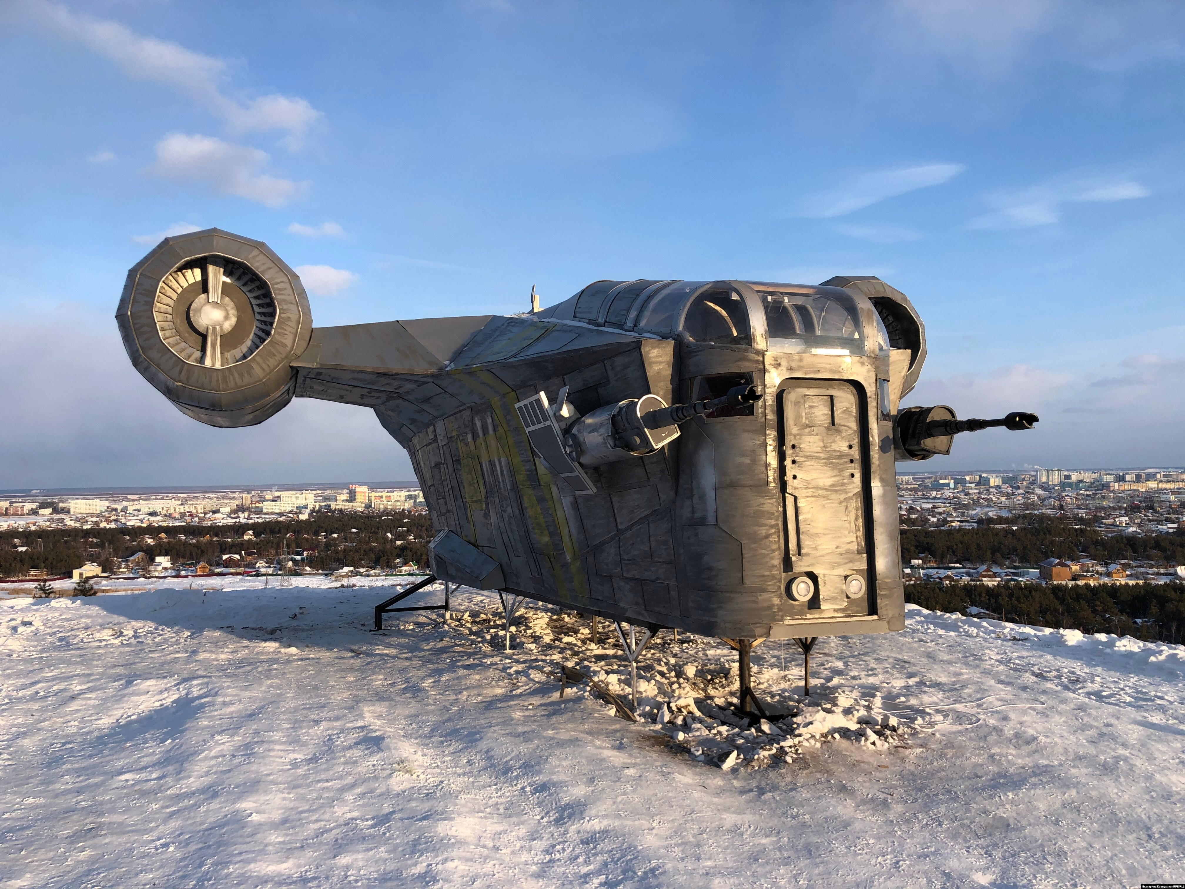 – Когда мы закончили все работы, я просто не знал, как эту штуку поднять вверх. Она ведь очень тяжелая, весит примерно тонну. Помог наш местный университет – СВФУ, мне на помощь отправили 30 человек, которые просто взяли руками и вытащили все на улицу. Дальше мы везли наш корабль через весь город в парк Урдэл, который располагается на сопке. С него открывается потрясающий вид на Якутск, и создается впечатление, как будто Razor Crest только что приземлился на землю. Уже там, в сильный мороз (градусник тогда показывал -30), мы устанавливали корабль на железные ножки. На всю установку у нас ушло 4 дня. Это было очень сложно. Я каждое утро просыпался и не знал, что будет, получится или нет. Это такое испытание, но я, конечно, надеялся, что мои расчеты будут верными.