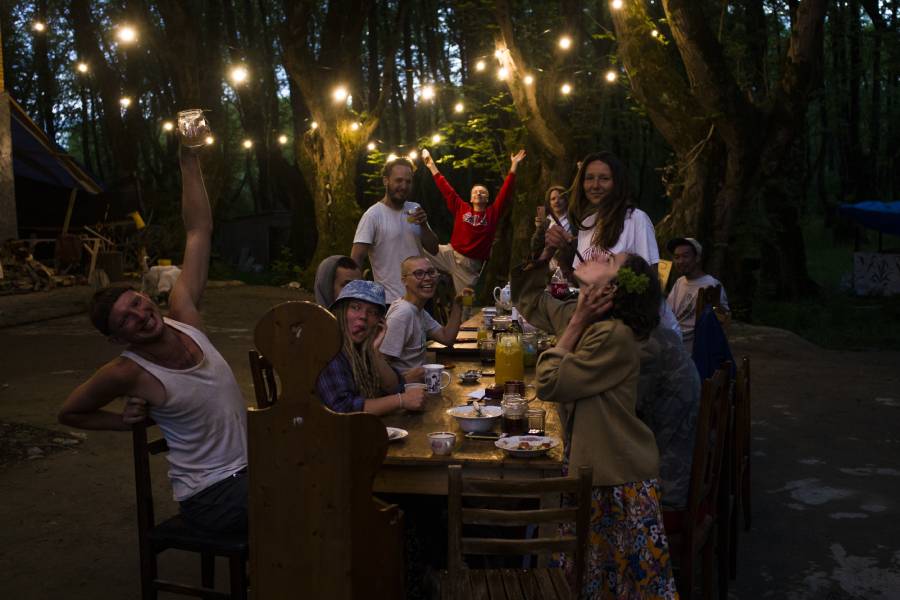 Потом началась пандемия — и мы поняли, что денег нам никто не даст, надо как-то выживать, пока это не закончится. Мы переформатировались в такую апокалиптическую секту: собрали 20-25 человек, которые были готовы долго там жить и самостоятельно выращивать себе еду. Быть максимально независимыми от внешнего мира. У нас была ферма в полгектара, мы полгода выращивали на ней овощи, зелень, ягоды и все это ели вместе в лесу за столом. Прошлой зимой у нас было до 25 волонтеров одновременно, а всего с ноября 2019 года к нам приехало больше 130 волонтеров. Это неожиданный для меня опыт, потому что волонтеры были вообще не из моего круга общения, ничего не знали про меня.