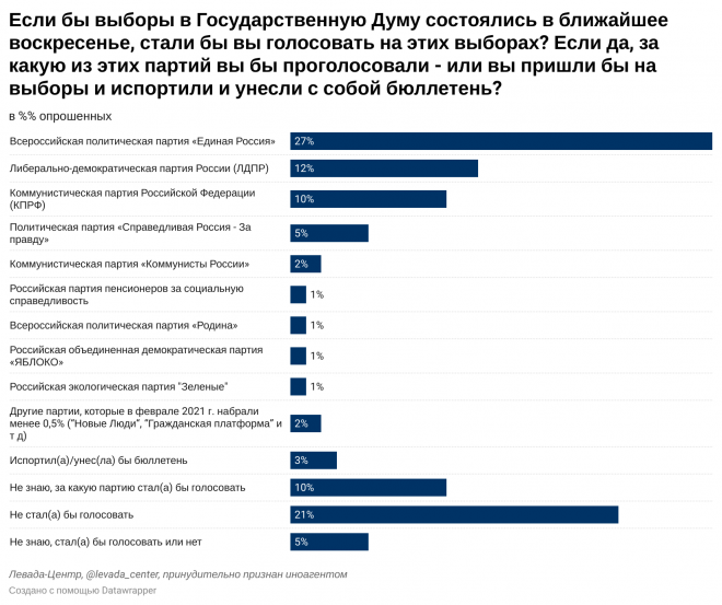 «ЛДПР упорно занимаются этой компанией, насоздавали своих штабов на каждой территории. Все остальные у нас находятся в коматозном состоянии, даже крупнейшая партия КПРФ не проявляет активности. Новых партий у нас просто нет. В Красноярском крае, наверное, будет большая степень апатии. Голосовать надо не только "против", но и "за", А вот "за" пока не видно, за кого. Протест против "Единой России" высокий, а вот кого избиратель мог бы поддержать, пока не видно. В Сибири всегда, если сравнивать средние показатели по России, на 10-15% меньше голосуют за "партию власти". Есть только два региона, которые выбиваются – Кемеровская область и Тыва. Но и внутри Красноярского края все-таки очень большой разброс – до 40% различаются результаты на разных территориях. Это очень много».Рейтинг «Единой России» снижается: на выборах в Государственную Думу за партию готовы проголосовать 27% респондентов, в августе 2020 г. – 31% респондентов. Таковы данные социологического опроса, проведенного «Левада-центром»* с 18 по 24 февраля.