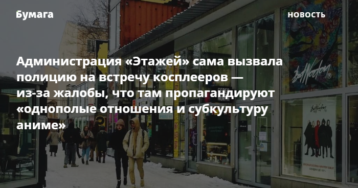 Администрация лофт-проекта «Этажи» сама вызвала полицию на мероприятие по косплею в стиле аниме, в результате чего около 20 подростков задержали. Об этом «Бумаге» администрация проекта сообщила в ответ на запрос.