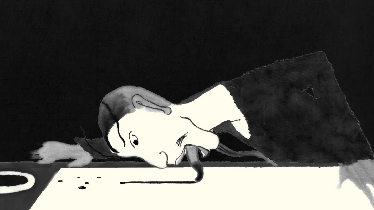 С этим неожиданно для Геллера радостным фильмом рифмуется работа Валентина Телегина «Слова на склоне». В живописных хокку человек-улитка ползет к себе в домик, спрятанный в горах. Роняет на рисовую бумагу черные бусины туши, которая длинными рыбами уплывает по реке. Кружится пластинка, снег сменяет дождь, луна — солнце. Время течет, как тушь на рисовую бумагу, соединяясь с всхлипом флейты: «Тихо-тихо ползи, улитка, по склону вверх. Склон Фудзи также одинок».