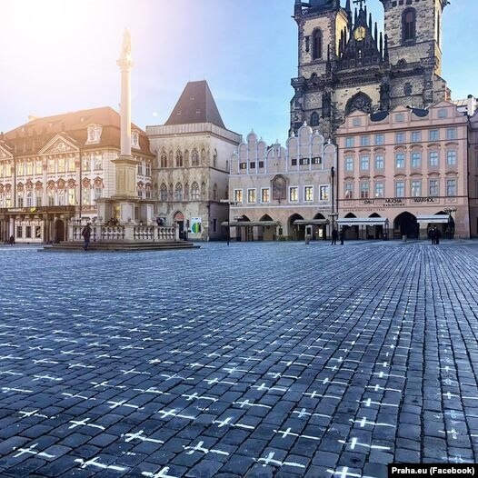 В Праге на брусчатку нанесли 25 тысяч крестов в память о жертвах ковида