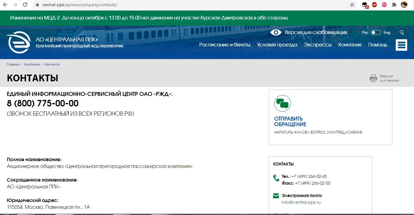Перевозчик также заявил, что телефон 8 (800) 775-00-00 не принадлежит АО "ЦППК", а принадлежит ОАО "РЖД" и они не получали мою претензию по телефону. Да, телефон принадлежит ОАО "РЖД", но используется АО "ЦППК", о чем они везде пишут, в том числе и на своем сайте. К тому же, согласно документам, совладельцем и держателем почти контрольного пакета акций АО "ЦППК" является ОАО "РЖД". И тут мы видим ситуацию, когда де-юре это разные компании, а де-факто понятно, что в общем-то одна.