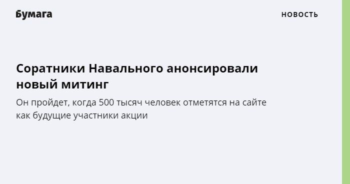 Соратники Алексея Навального анонсировали новый митинг. Дату его проведения назовут, когда более 500 тысяч человек отметятся на сайте политика как будущие участники акции.