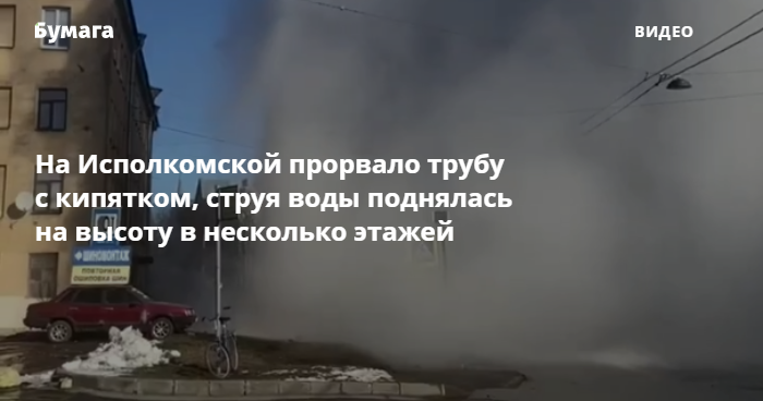 На Исполкомской улице, 17 прорвало трубу с горячей водой. Струя воды поднялась на высоту нескольких этажей. Очевидцы опубликовали видео в группе «ДТП и ЧП» во «ВКонтакте».