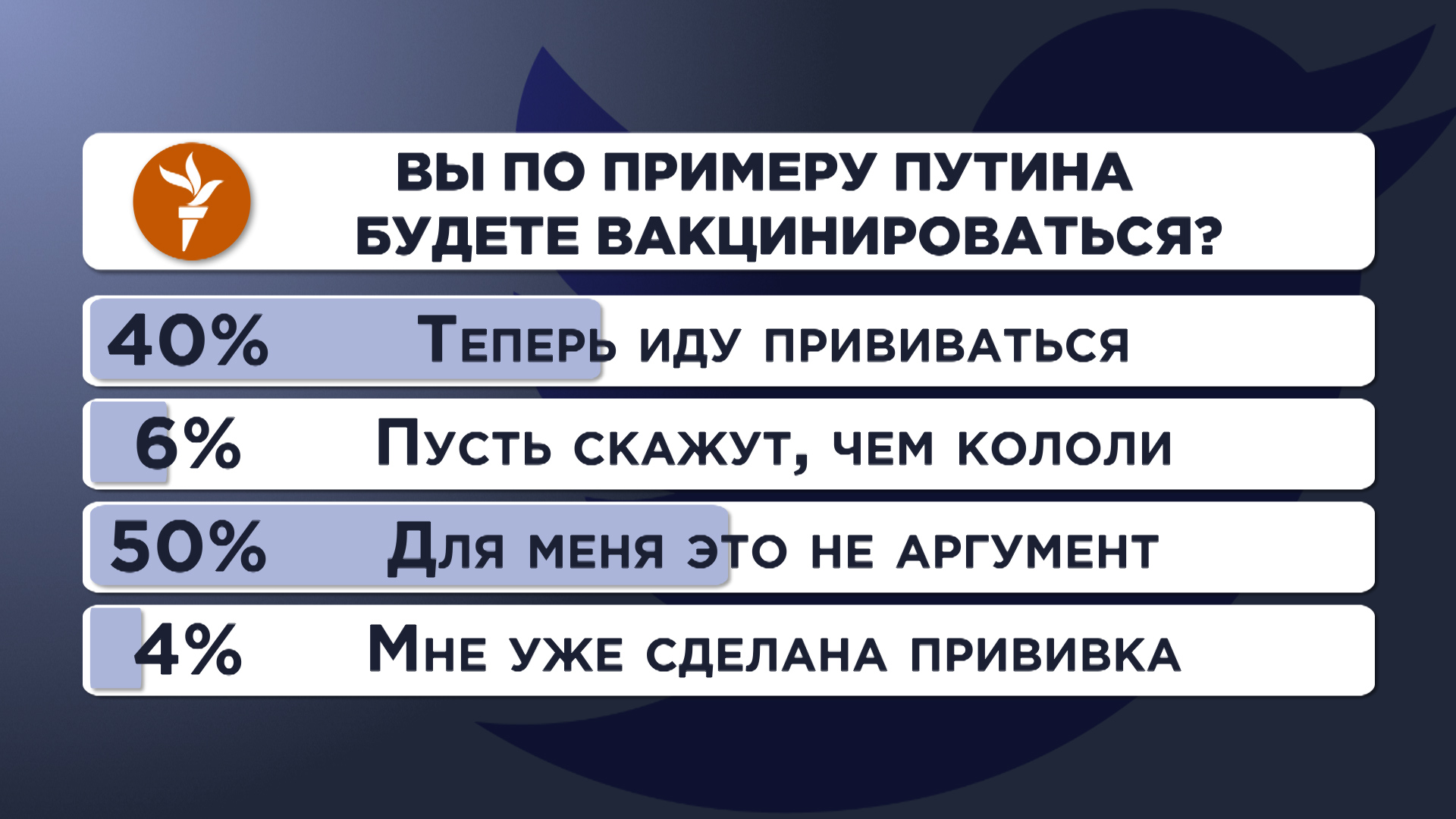 Михаил Соколов: У нас есть опрос в интернете довольно интересный, там лидировал пункт "теперь иду прививаться", было почти 60%, но потом боты как-то немножечко притормозили, победил пункт "для меня это не аргумент" – 50%, маленькие "пусть покажут, чем кололи" и "мне уже сделана прививка", 4%. Кстати говоря, практически совпадает с тем, что на самом деле нам дает статистика, порядка 4–5% всего пока вакцинировалось.