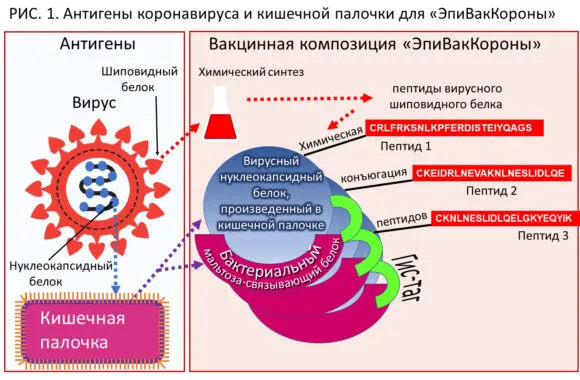 Слева на рис. 1 изображен коронавирус SARS-CoV-2 и стрелочками отмечены два вирусных белка, а именно шиповидный, который обозначен красном сердечком снаружи вируса, и нуклеокапсидный, который обозначен синим кружочком внутри вируса. Для того, чтобы иммунная система человека научилась распознавать шиповидный белок вируса, в состав «ЭпиВакКороны» вводятся три фрагмента этого белка, которые разработчики химически синтезируют. Этот процесс обозначен как «химический синтез» на правой части рисунка. Каждый белковый фрагмент (пептид) представлен последовательностью аминокислот, обозначенными белыми буквами на красных полосках в правой части рисунка.