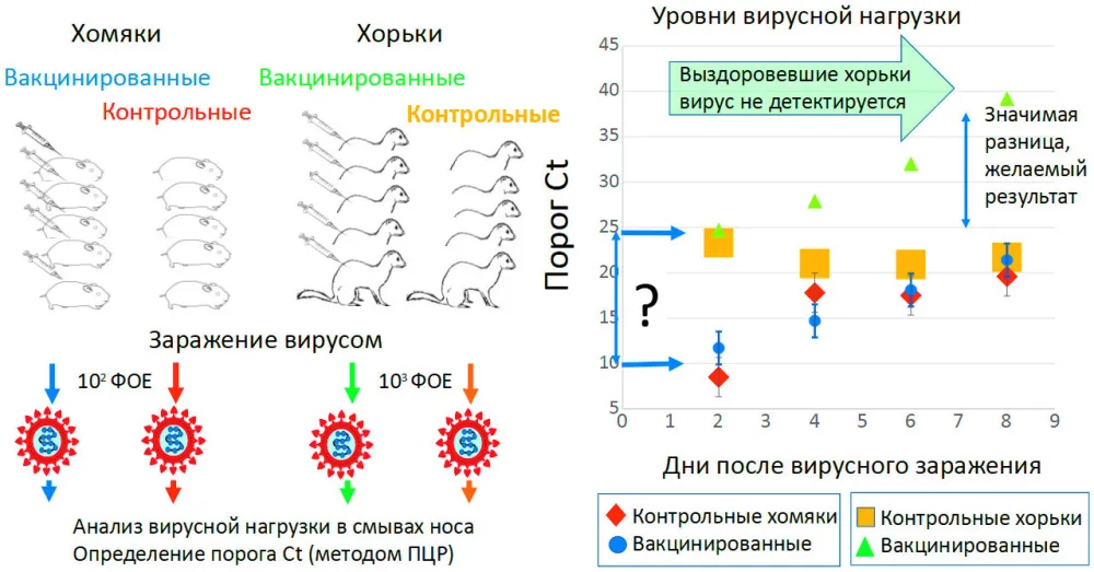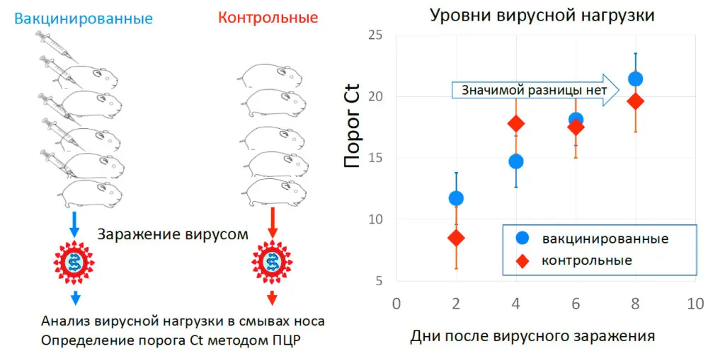 Патент [2] сообщает что пять опытных хомяков были вакцинированы и затем заражены вирусом одновременно с контрольными (не получившими вакцину). После этого каждые два дня в смывах носа хомяков из обеих групп проверялась вирусная нагрузка: для этого измерялось число циклов ПЦР до момента появления сигнала в виде визуализации генетического материала вируса (порог Ct).