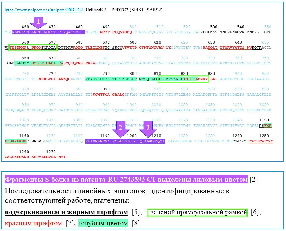 В нижеприведенной таблице показаны последовательности пептидов, вошедшие в состав вакцины и фрагменты белка, которые содержат экспериментально подтвержденные В-клеточные эпитопы, показанные ранее на рис. 2. Второй и третий пептид «ЭпиВакКороны» перекрываются, поэтому в таблице они представлены одной последовательностью.