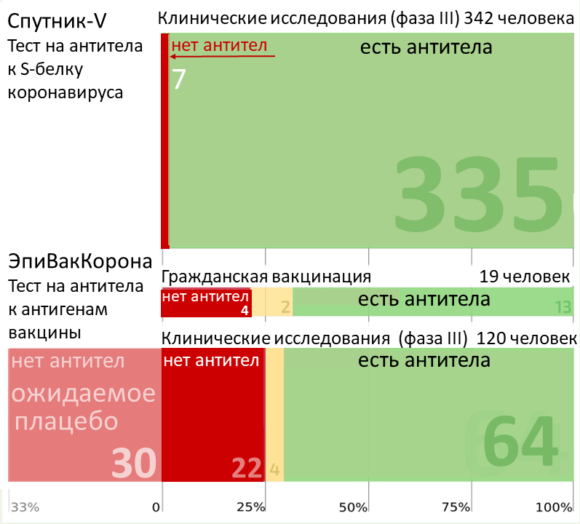 Нужно заметить, что группа участников КИ, по заявлениям организаторов испытаний, должна составлять около 3 тыс. человек, из которых 25% входят в группу плацебо, а 75% получили вакцину. Поэтому в выборке из 116 добровольцев КИ можно ожидать, что примерно 25% человек получили инъекцию плацебо; соответственно, 75% получили вакцину. Однако антитела не обнаружились у 52 человек из 116, что превышает 25% от общей выборки.