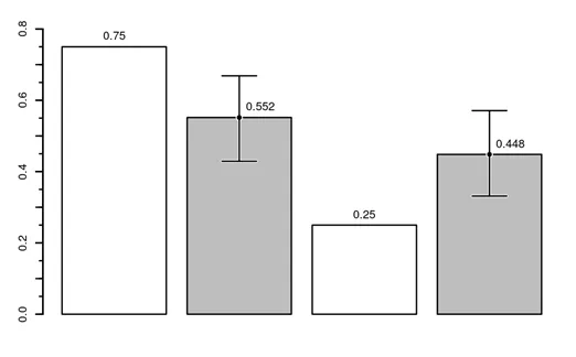 По имеющейся выборке в 116 человек можно попытаться оценить долю людей с антителами в генеральной совокупности. Выборка невелика по объему, поэтому доверительный интервал получается довольно широким, однако и он не захватывает теоретически ожидаемые частоты (см. рис. 2). Доля людей с антителами оценивается как 55.17 ± 12.27% (99% доверительный интервал), что далеко не достигает ожидаемых 75%. Если нулевая гипотеза (о соотношении людей с антителами к людям без антител равном 3:1) верна, то вероятность получить соотношение 64 : 52 в случайной выборке приблизительно равна 1.404 × 10-6 (Хи-квадрат = 23,3 при числе степеней свободы, равном 1).