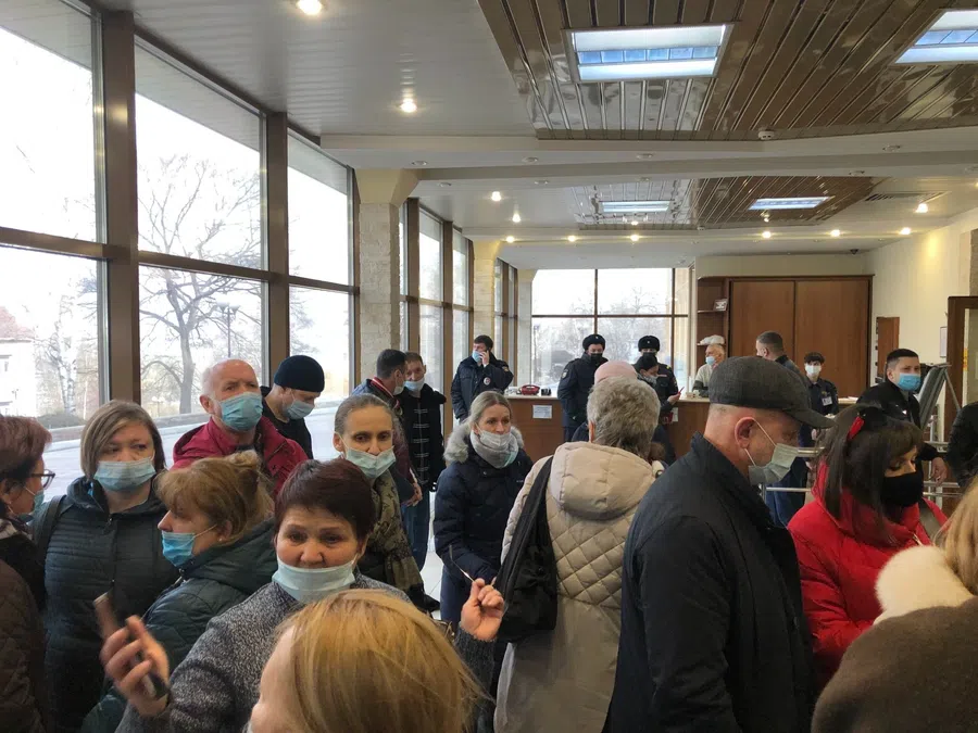 Жители Находки, кто против и не попал в зал, кричат, что приехавшие организованно «за» — не жители Находки. В холле столпотворение, слышна ругань.
