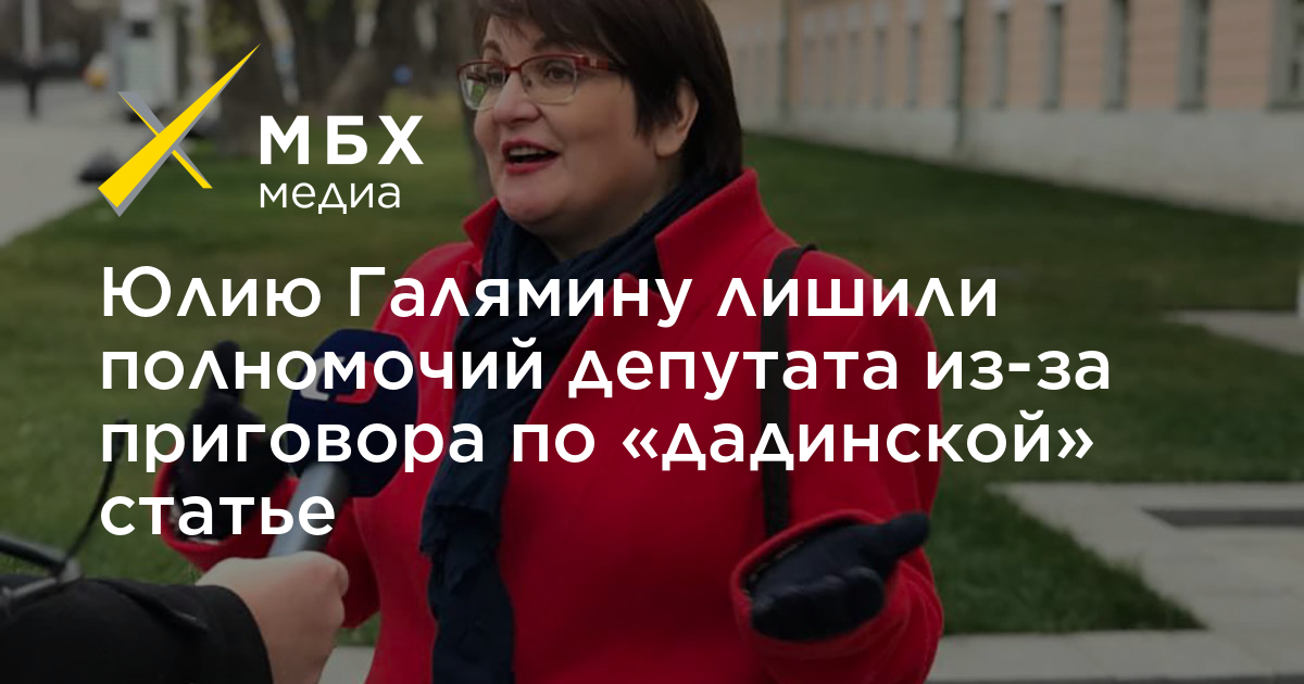 Совет муниципальных депутатов округа Тимирязевский досрочно прекратил полномочия Юлии Галяминой из-за вступления в силу приговора за неоднократное нарушение правил проведения митингов (статья 212.1 УК). Об этом сообщил «МБХ медиа» муниципальный депутат Сергей Довгаль.