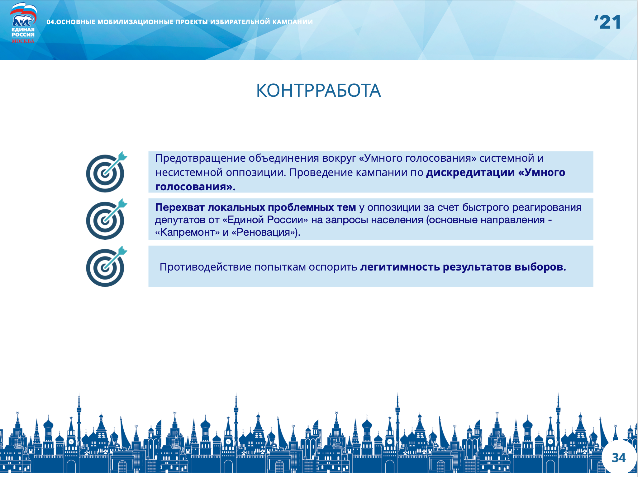 «Создание зеркального сайта „Умного голосования“, выдвижение кандидатов-спойлеров, превращение мероприятий оппозиции в „цирк“, радикализация и маргинализация их требований», — перечисляются в стратегии методы борьбы с информационными угрозами. В ход должны пойти и другие политические технологии: «постановка блока в федеральных СМИ», «внесение межпартийных конфликтов, информационные вбросы, направленные на стимуляцию конфликта между партиями и раскола внутри них».