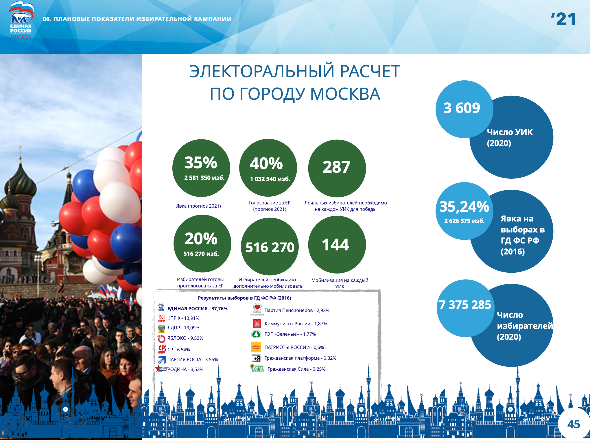 На выборах в Госдуму в сентябре 2021 года партия «Единая Россия» рассчитывает получить 40% голосов московских избирателей при явке 35% — это даже немного превышает прежние показатели на парламентских выборах (38% голосов при явке 35,2%). Сейчас рейтинг ЕР в Москве составляет всего 20% (хотя в среднем по России — 32%), а 55% жителей столицы хотели бы поддержать независимого или оппозиционного кандидата. Несмотря на это, единороссы намереваются одержать победу в большинстве одномандатных округов (всего в Москве их 15). Для достижения этих целей нужно, чтобы за «Единую Россию» в Москве проголосовали чуть больше миллиона человек. Всего в Москве числится 7,44 миллиона избирателей, то есть единороссам нужен голос каждого седьмого из них.