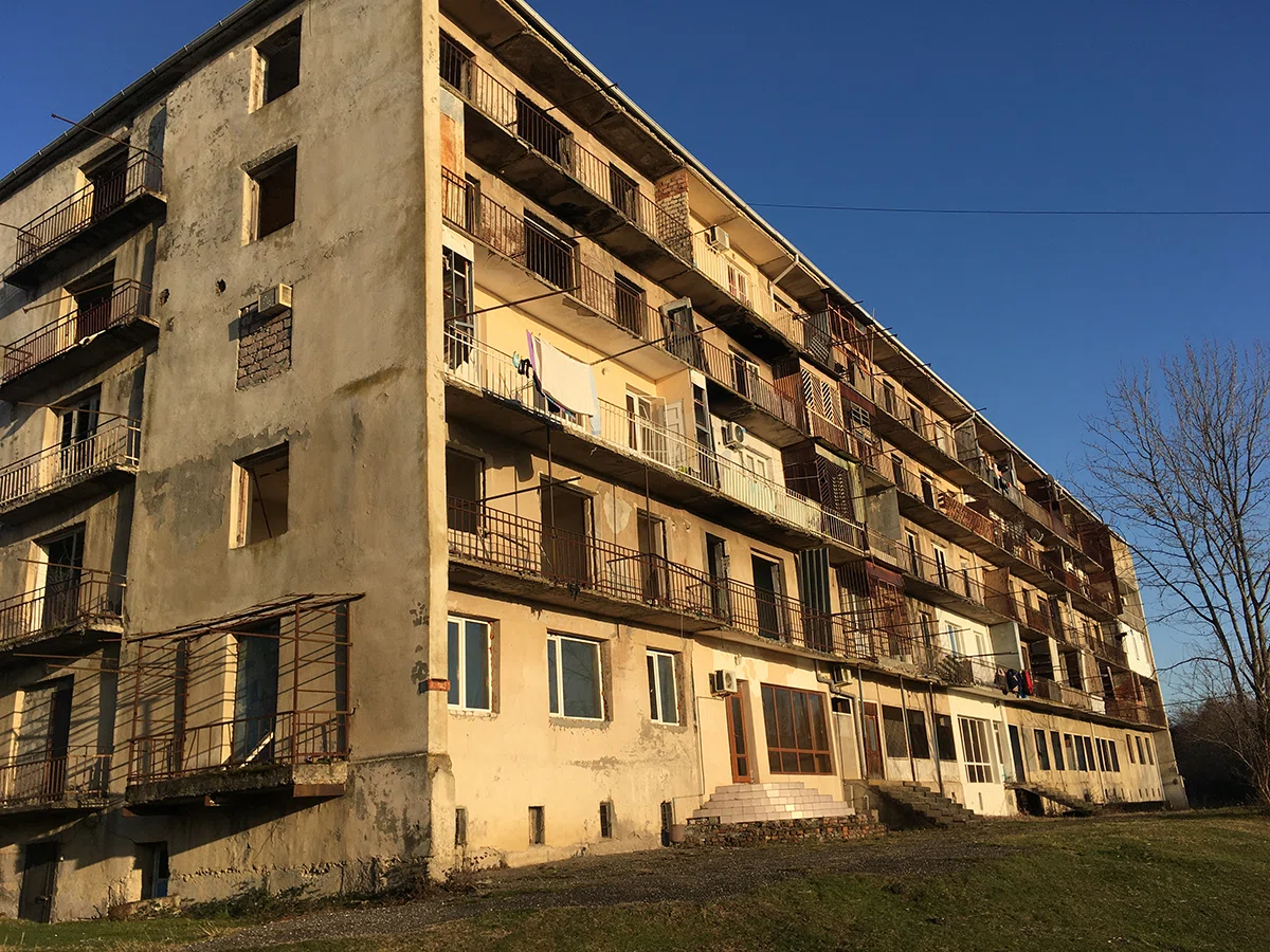 Пятиэтажка с выдолбленными окнами торцом выходит на детскую площадку с пыльной горкой и неподвижными качелями. Рядом в песок воткнута длинная синяя труба, на ней развевается национальный флаг Абхазии. Вдоль трубы-флагштока протянута веревочка. Флаг можно по утрам торжественно поднимать.