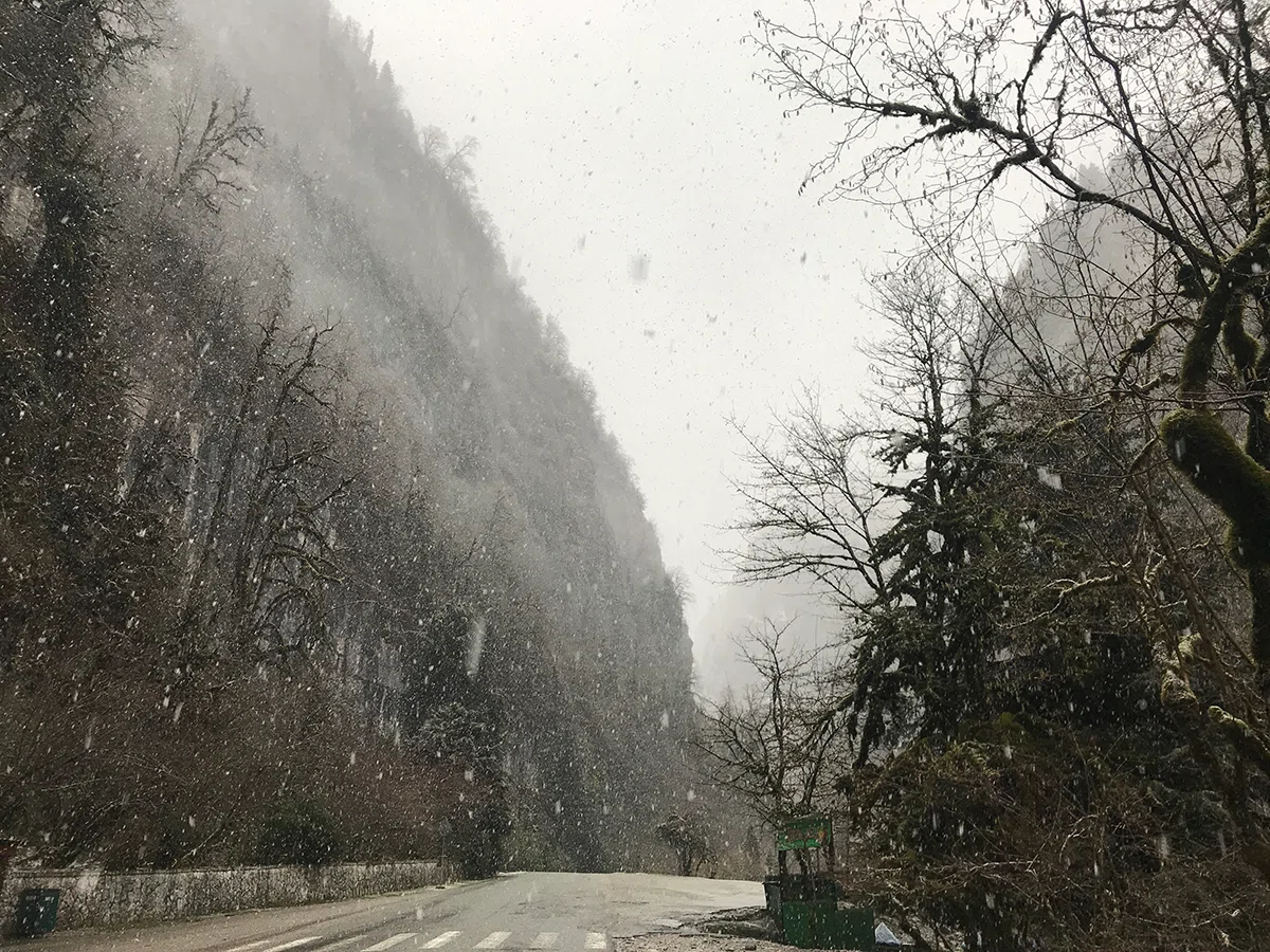 Дорога ныряла и крутила дальше. У меня на глазах весна стала превращаться в зиму, дождь — в снег. Горы со всех сторон как будто присели и стали совсем низкими. Это означало, что я уже высоко поднялась и скоро увижу Рицу. Озеро находится на высоте километра над уровнем моря.